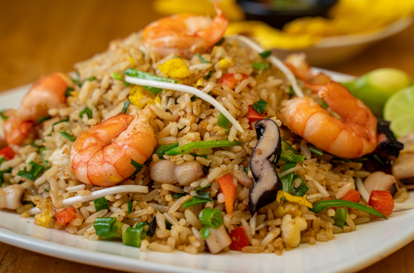 Chaufa de mariscos o pescado con chicharrón de pescado o mariscos